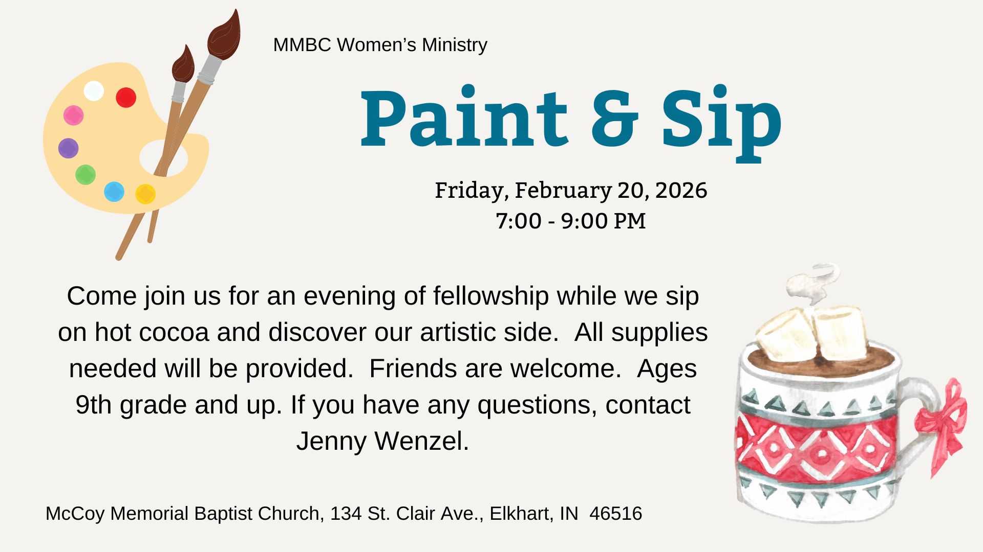 –Thursday evening Cardio Drumming: 5:30 PM (Led by Anna Yoder)